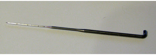 上面是單支戳針的大致構造,柄部平滑,針表面的凸起都很微小,所以雖然摸來粗粗的,可是不會扎手,也不會把毛纖維勾起來。針尖非常銳利,這樣才容易戳進緊密的毛氈隙縫。另一個好處是又尖又小,被戳到時不會很痛,有時直到看見手染血了,才會發現被戳到了。